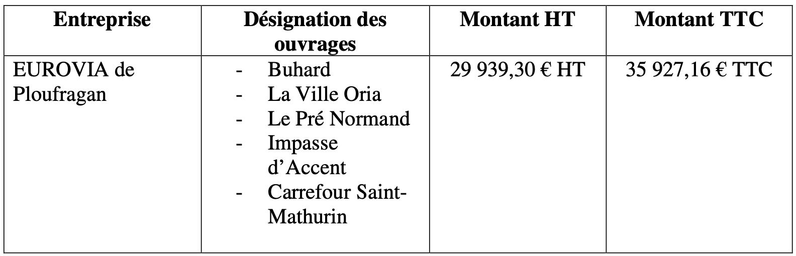 Au vu de l’analyse des offres présentée par l’ADAC22, la commission propose de retenir l’offre de la Société Eurovia pour un montant de 29 974,75 € HT, soit 35 969,70 € TTC qui est validé par le Conseil Municipal.