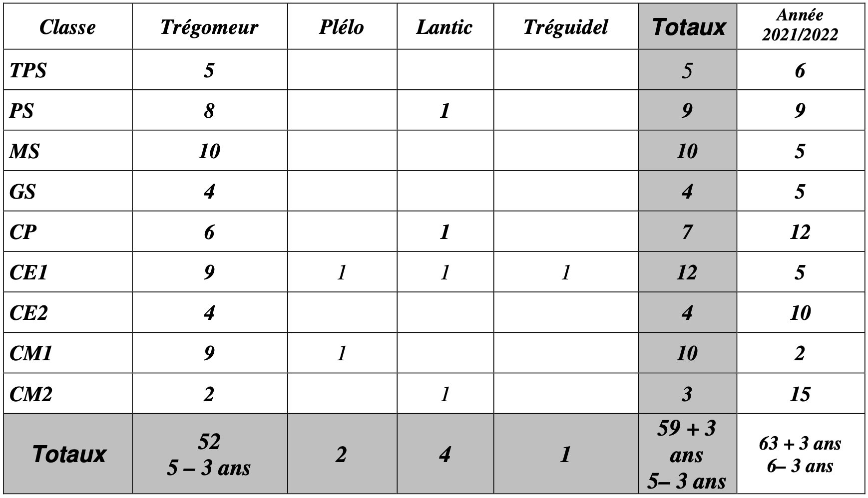 Effectifs à l’école Sainte-Thérèse